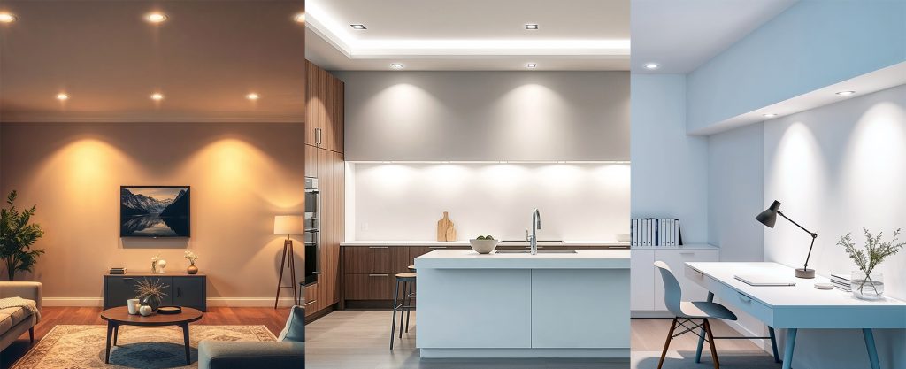 Drei Räume – das Wohnzimmer in warmweiß, die Küche in neutralweiß und das Home-Office in tageslichtweiß